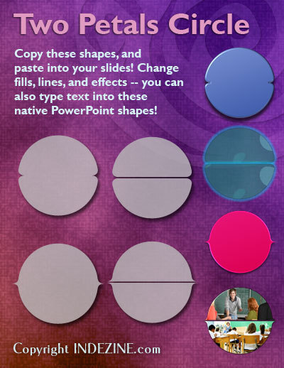 The sample presentation that you download comprises a two petals circle contained within several separate slides, including one with a picture fill, another with just a solid color fill, and many more. Copy these shapes to your PowerPoint presentation and change the fills and effects of individual shapes and segments, using PowerPoint’s fills, lines, and effects. Or if you like one of the hundreds of samples within the downloaded presentation, just use the Format Painter button to copy those attributes to your other shapes. You can also apply animation to the shapes. These shapes and segments are all editable within PowerPoint.