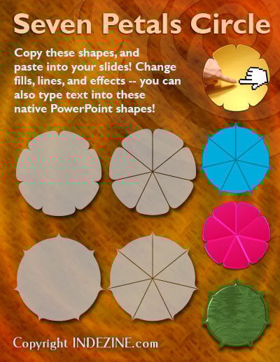 The sample presentation that you download comprises a seven petals circle contained within several separate slides, including one with a picture fill, another with just a solid color fill, and many more. Copy these shapes to your PowerPoint presentation and change the fills and effects of individual shapes and segments, using PowerPoint’s fills, lines, and effects. Or if you like one of the hundreds of samples within the downloaded presentation, just use the Format Painter button to copy those attributes to your other shapes. You can also apply animation to the shapes. These shapes and segments are all editable within PowerPoint.